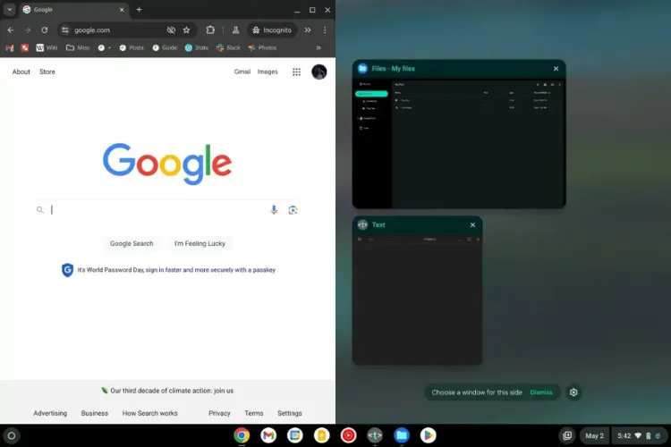 قابلیت جدید راهاندازی سریعتر حالت اسپلیت اسکرین، برای کاربران ویندوز آشنا بهنظر میرسد. پس از اینکه اپلیکیشنی را به یک سمت صفحه انتقال دهید، پیشنمایش سایر اپلیکیشنها در سمت دیگر ظاهر میشوند و در این حالت انتخاب یکی از اپلیکیشنها، آن را کنار اپلیکیشن اول قرار خواهد داد.