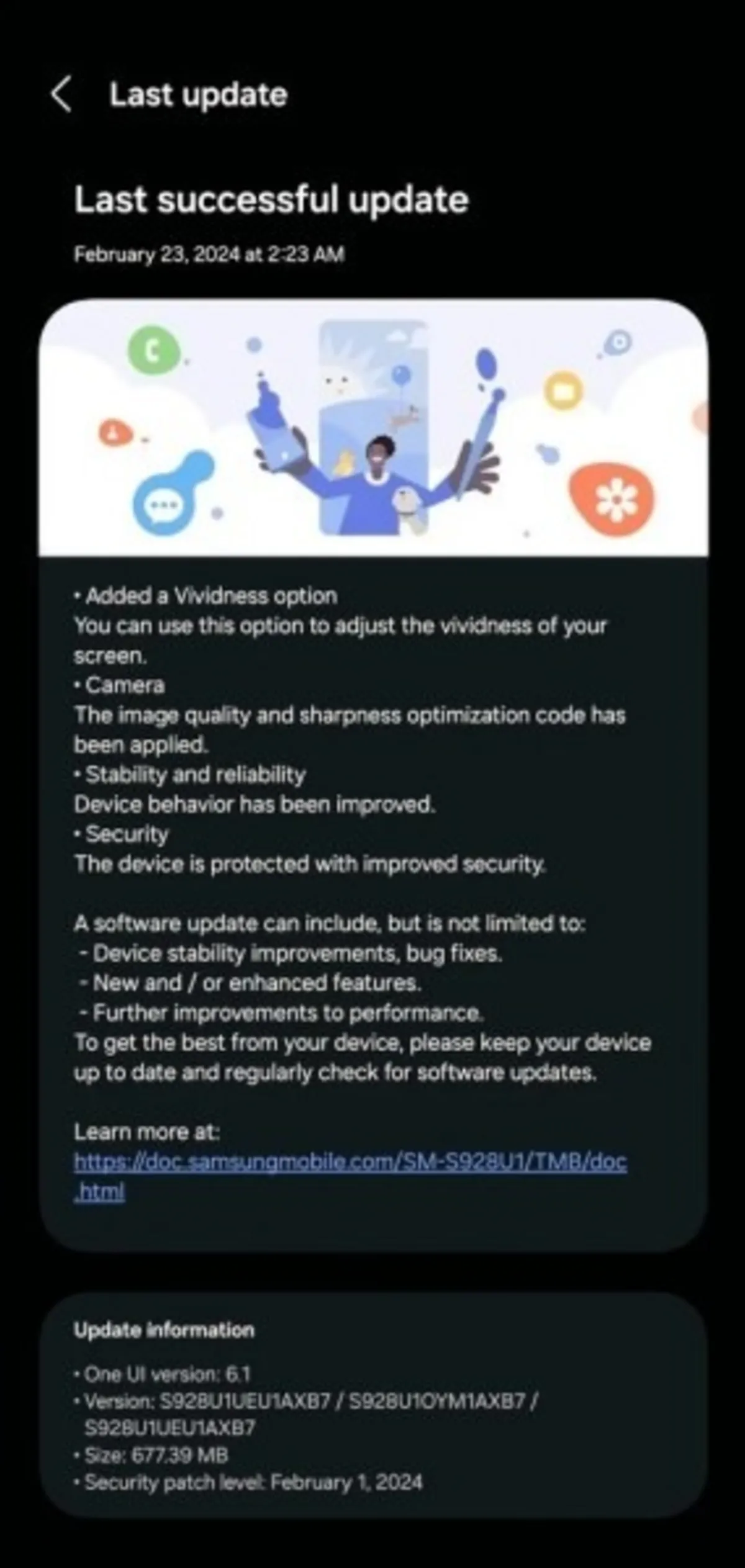 آپدیت جدید با فرمور S92x1UEU1AXB7 منتشر شده و حجمش حدود ۶۸۰ مگابایتی است. این آپدیت همراه با پچ امنیتی فوریهی ۲۰۲۴ (بهمن و اسفند ۱۴۰۲) ارائه میشود.