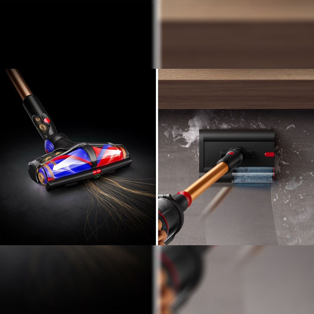 جارو شارژی دایسون مدل Dyson V16 Piston Animal Submarine دارای سری جدید All Floor Cones™ Sense با دو برس مخروطی است که مانع پیچیدن مو به دور برس میشود. و از دیگر ویژگیهای خارقالعاده ی این جارو توانایی تشخیص خودکار نوع سطح (سخت یا فرش) است که به وسیله ی آن سرعت برس و مکش متناسب را تنظیم میکند.